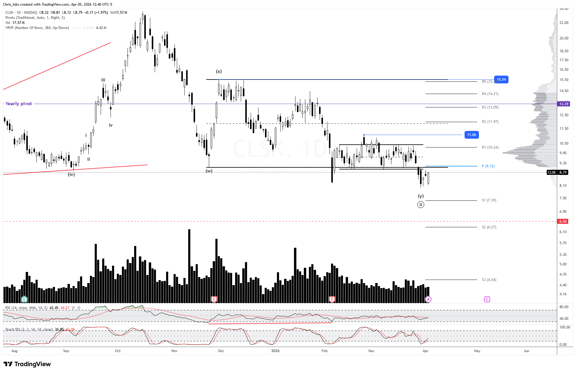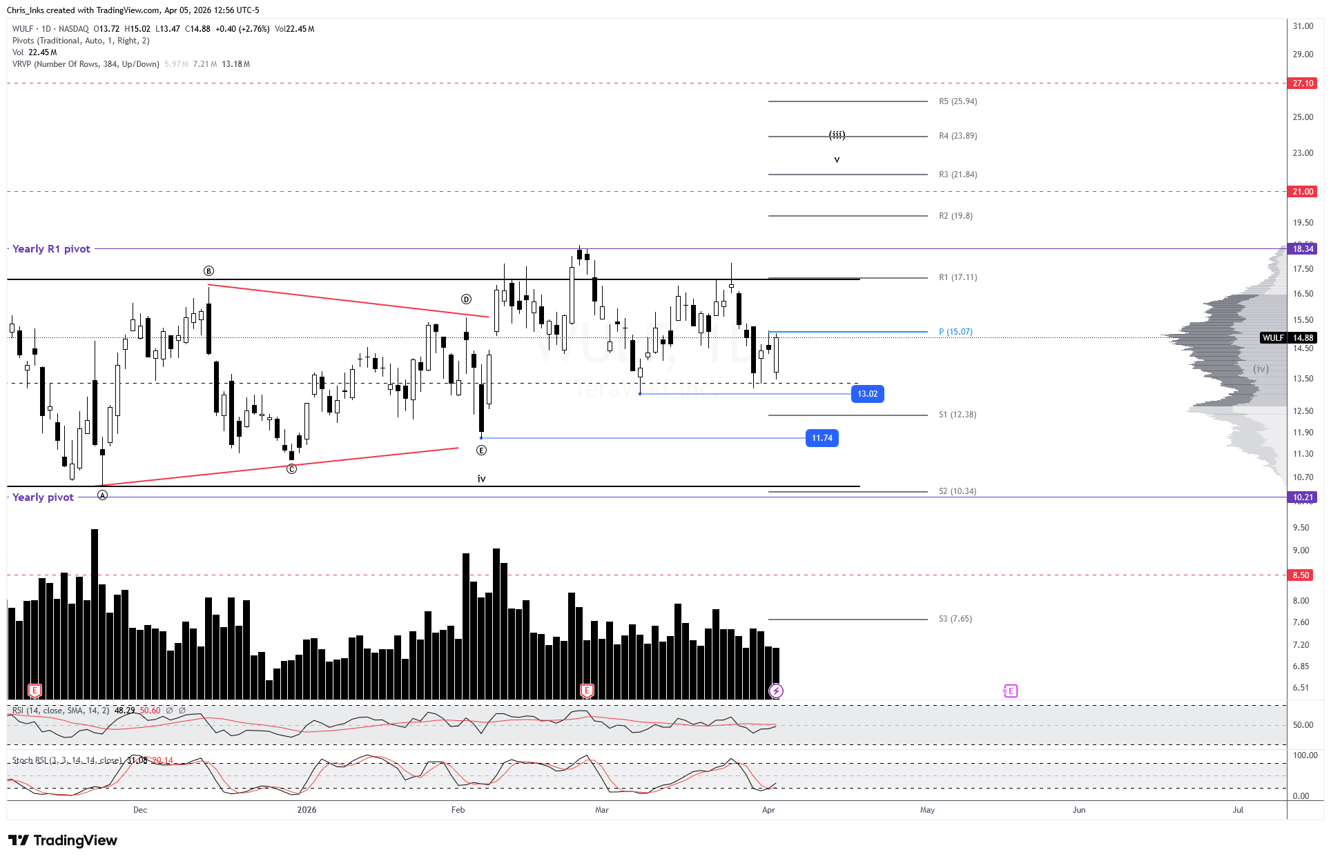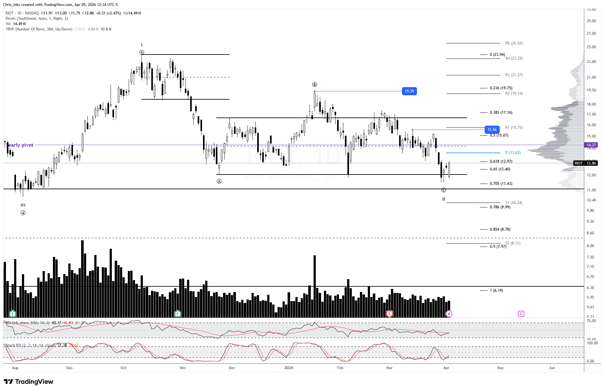 Breaking down below wave ii will keep wave ii alive with a target of the 78.6% retraement level at 9.99, right around the monthly S1 pivot.