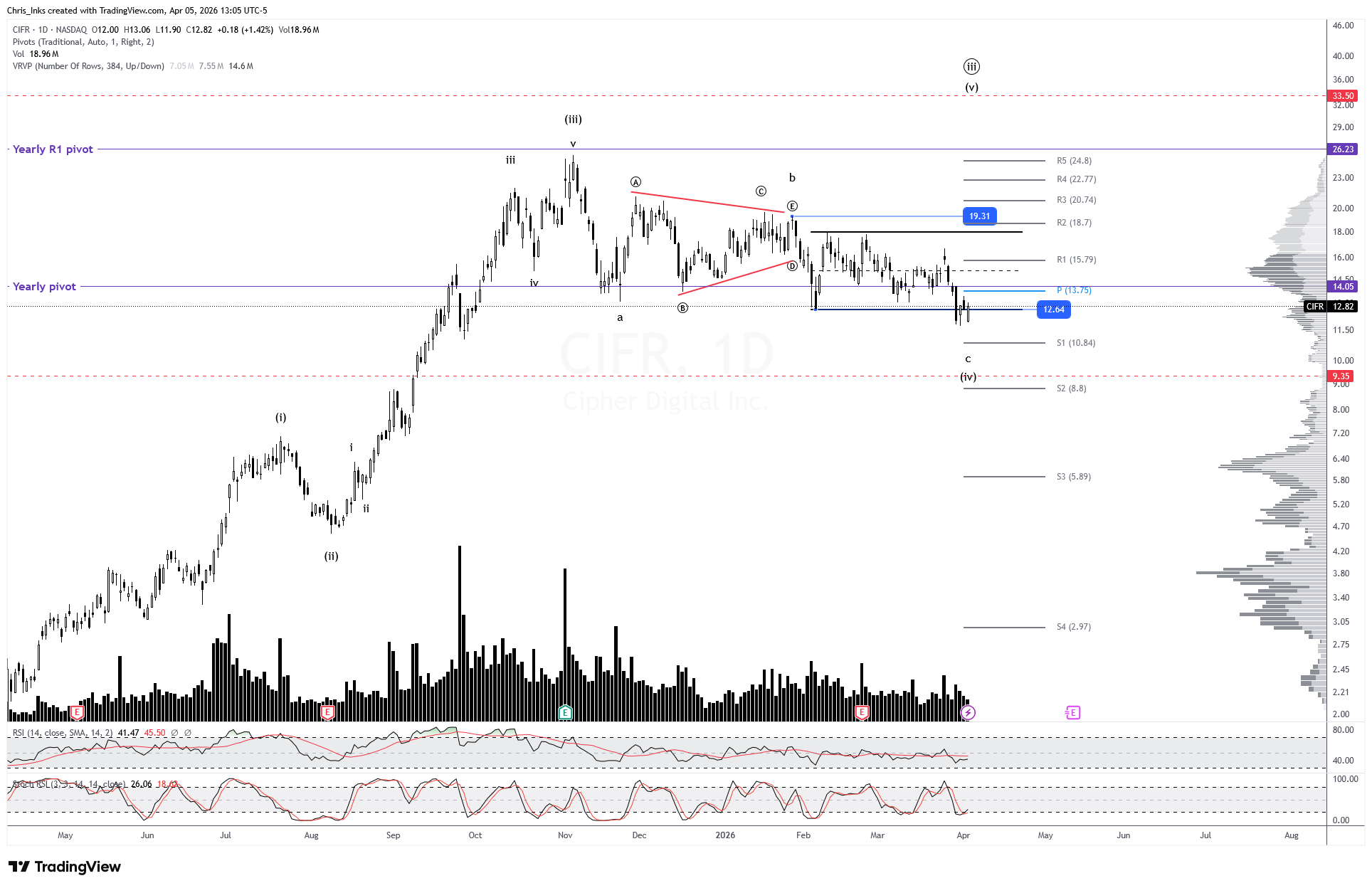 Price swept wave (iv) at 12.64, keeping wave (iv) alive. Continued breakdown has an initial target of the monthly S1 pivot at 10.84 or secondary pattern target of 9.35.