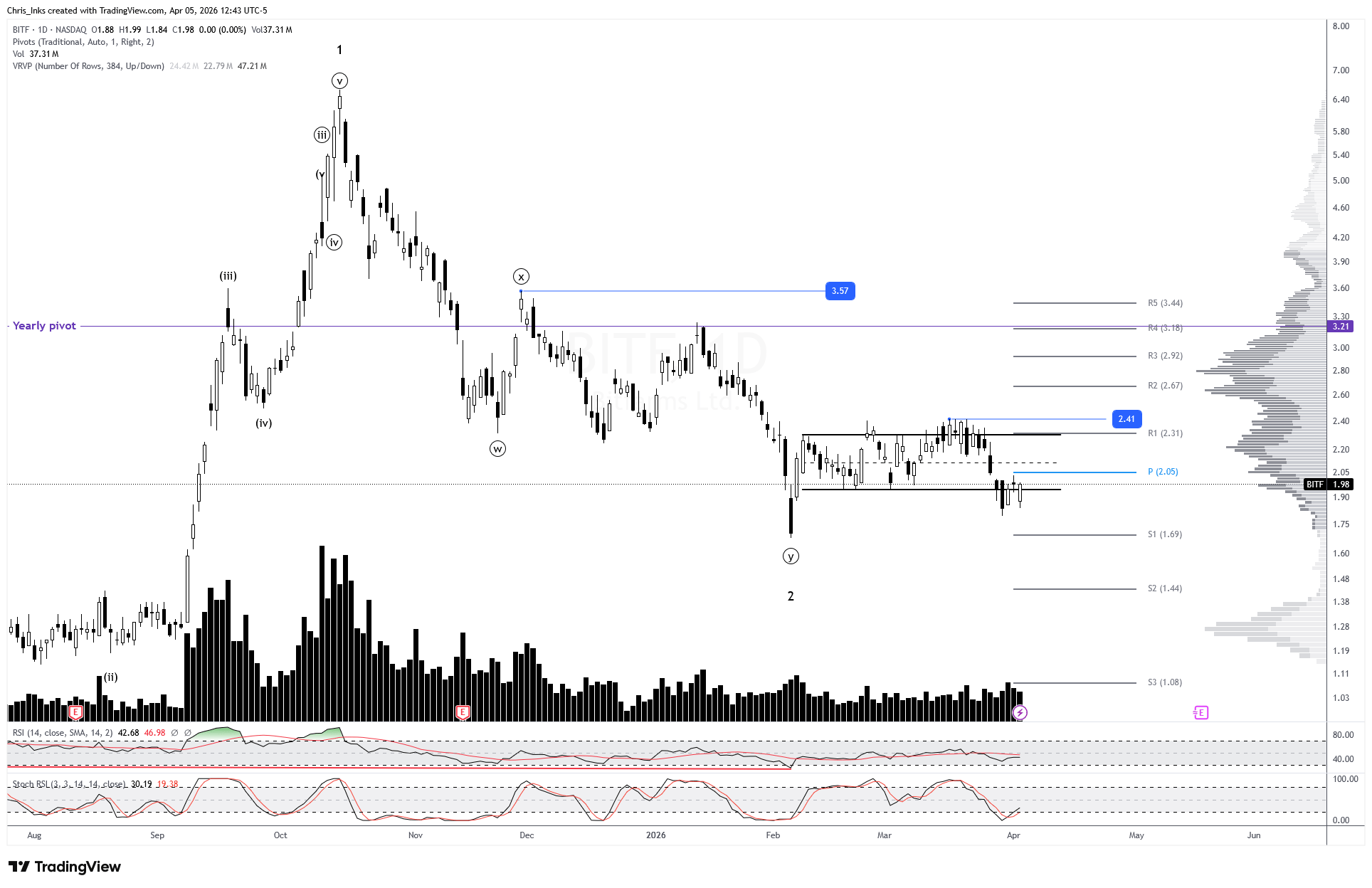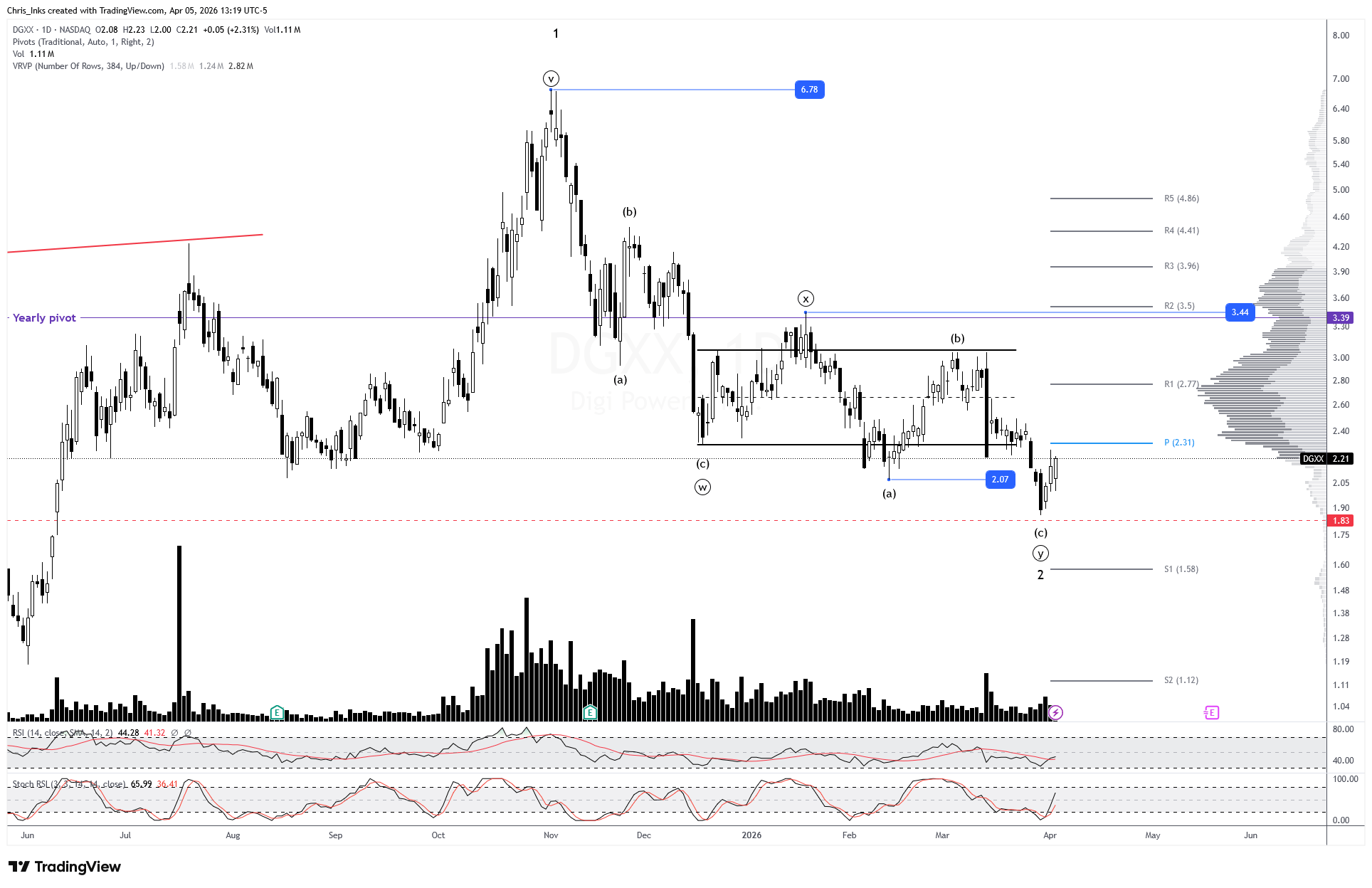 An impulsive daily candle breakout and close above the monthly pivot at 2.05Breaking out and closing above 2.30 will give us a target of the 2.47 internal swing high. Breaking out above that level should likely indicate that the pullback is complete. Further breakout above wave ((x)) resistance at 3.57 will add confidence to the count. Wave 3 has a minimum expected target of 11.25.