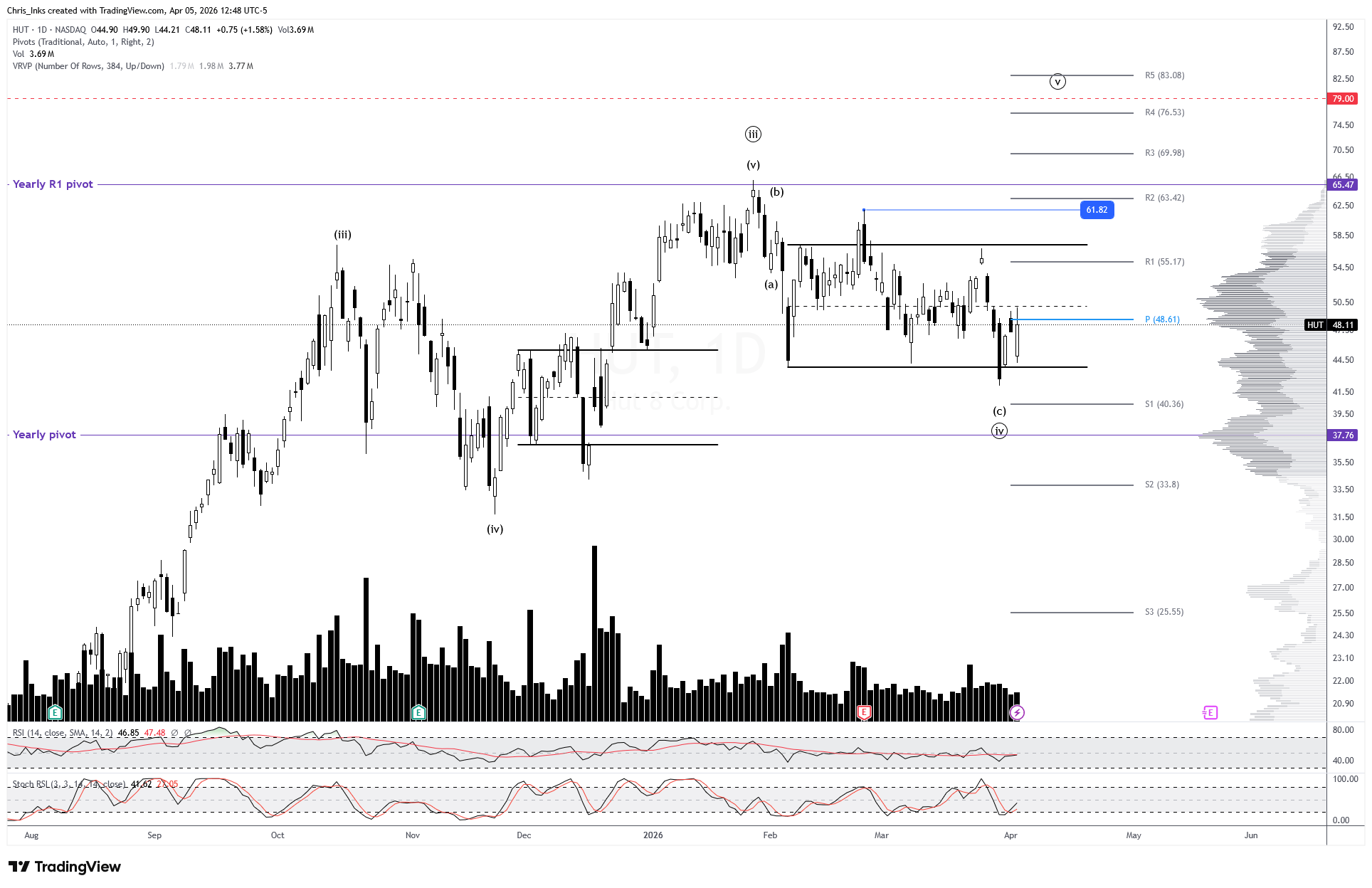 Price swept the wave ((iv)) extreme at the range support, keeping wave ((iv)) alive. But the monthly pivot at 48.61 held as resistance on the bounce. Breaking down further has a secondary target of the monthly S1 pivot at 40.36 followed by the yearly pivot at 37.76.