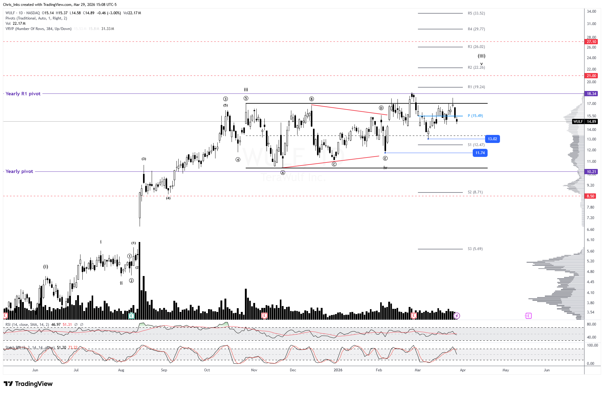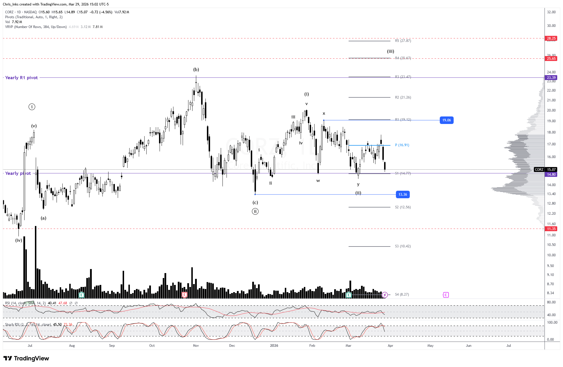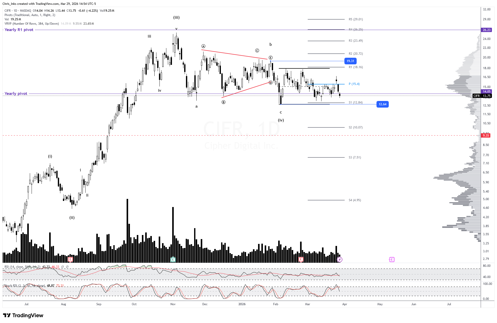 Price bounced into the monthly pivot by Wednesday, was rejected, and pulled back below the local swing low around the monthly S1 pivot by the end of Friday. Daily RSI still has not reset into oversold, so traders should remain cautious for now. A breakout above 15.56 should indicate that the pullback is likely complete. Further break out above wave ((B)) at 19.39 will add confidence to the count and indicate that wave iii is likely in progress toward a minimum expected target of ~40.60.