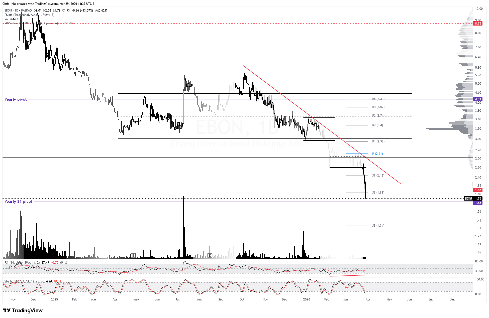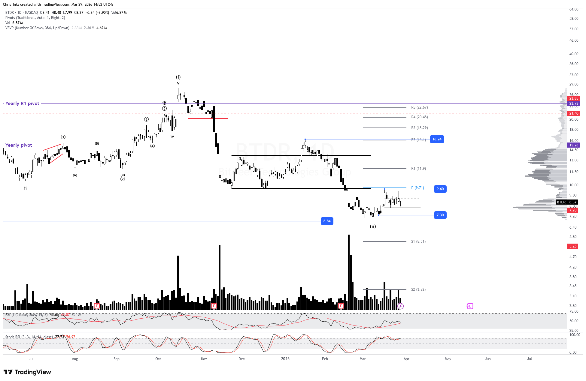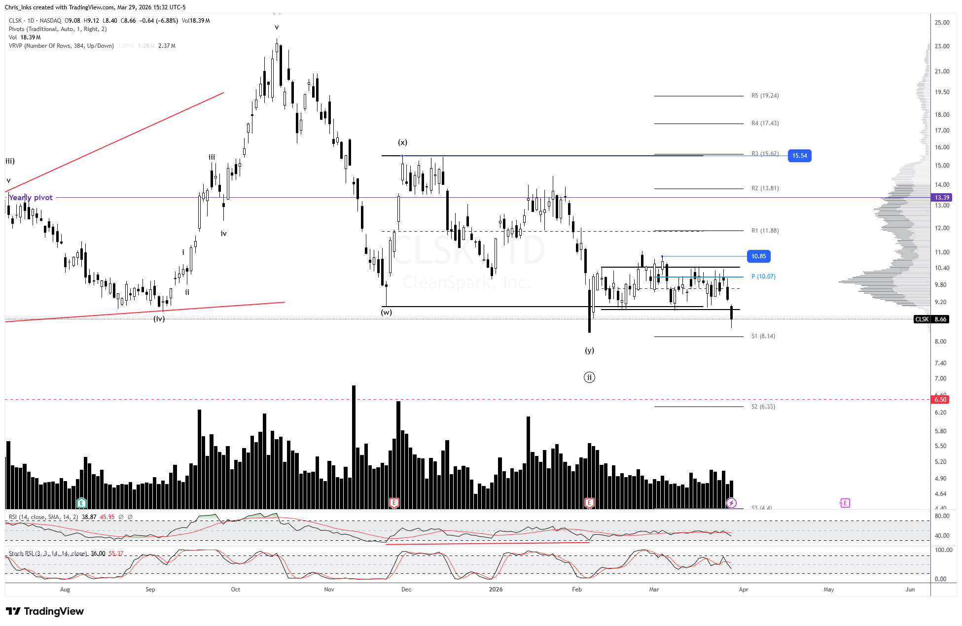 Price bounced almost into the monthly pivot once more before pulling back toward the local range low. The push higher off the wave (ii) extreme only appears to be in three waves right now, making it likely corrective. A breakdown below 7.30, without breaking out above the local range high at 9.60 first, will add confidence to the idea that it’s corrective, and we should then expect price to break down further. Breaking down below 6.84 will indicate that the overall structure into the October 15, 2025 swing high was likely wave (i) as a leading diagonal, rather than just the most recent rally off 6.84, and that will give us a pattern target of ~5.25.