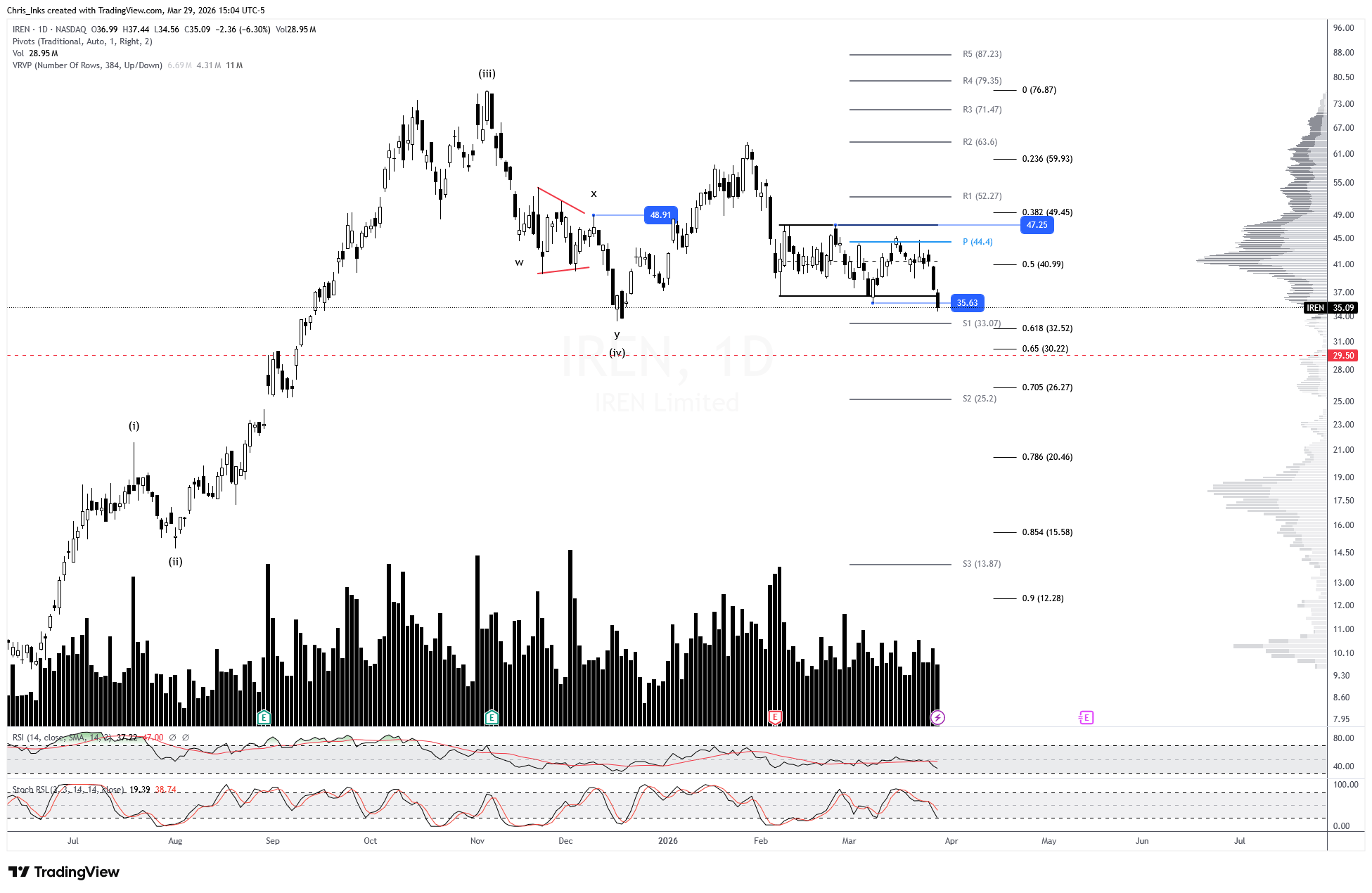 Price swept the wave ((iv)) swing low which keeps wave ((iv)) alive. If price continues lower, then we have an initial local pattern target of ~31.30 and secondary larger pattern target of ~24.86.